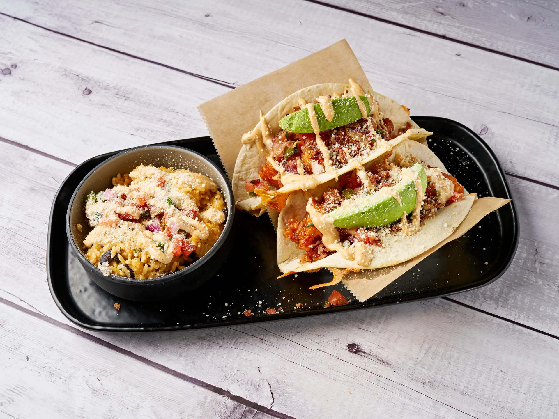 Cheesy tortilla, choice of protein, bacon, avocado, pico de gallo, chipotle cream sauce, and cotija cheese