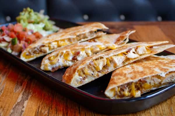 Grilled chicken, crispy bacon, ranch, with mixed cheddar and Jack cheeses in a flour tortilla served with pico de gallo and guacamole