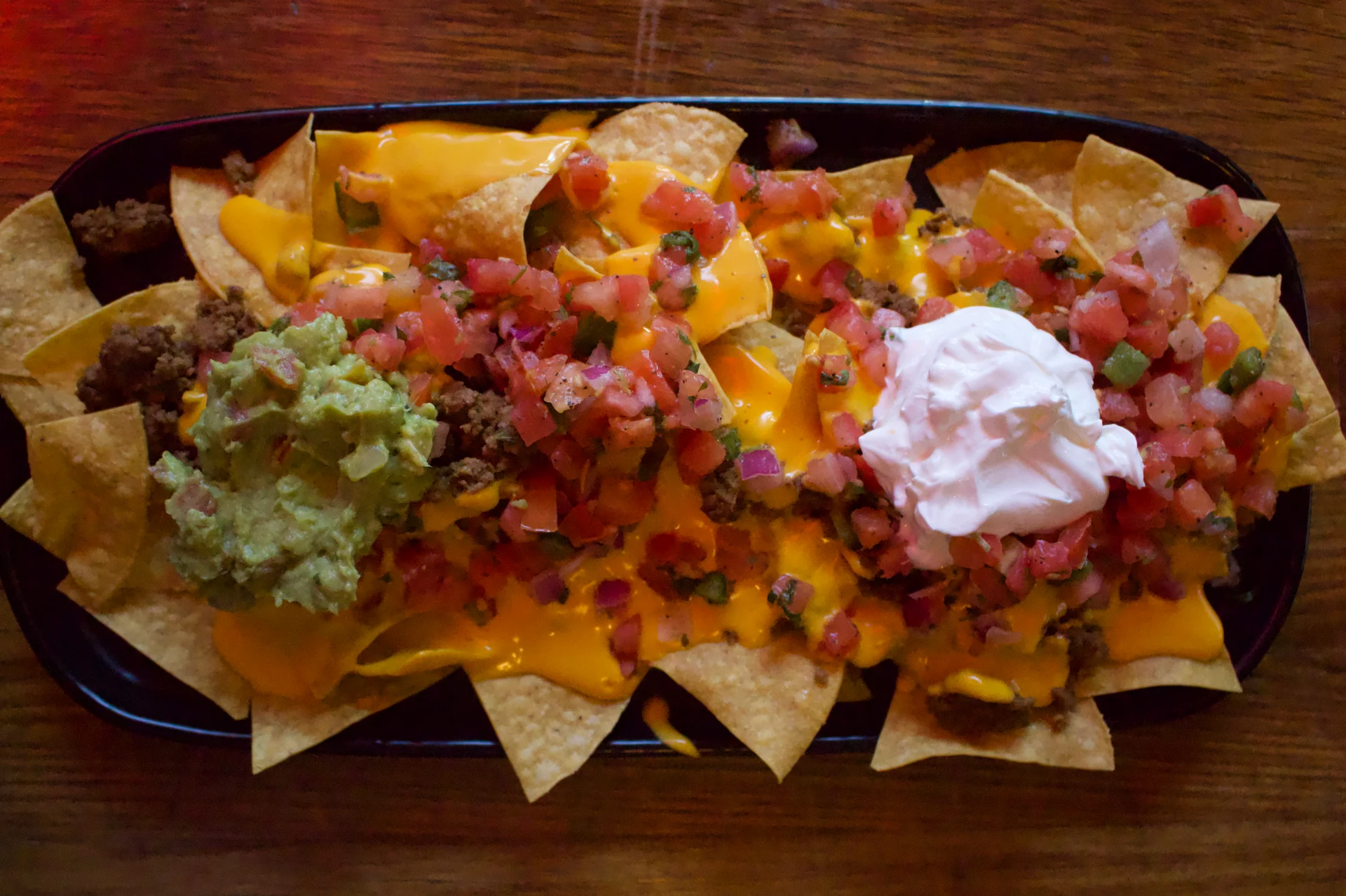Crispy tater tots with your choice of beef, spicy chorizo, pulled pork, or chicken, topped with nacho cheese, pico de gallo, guacamole, and sour cream