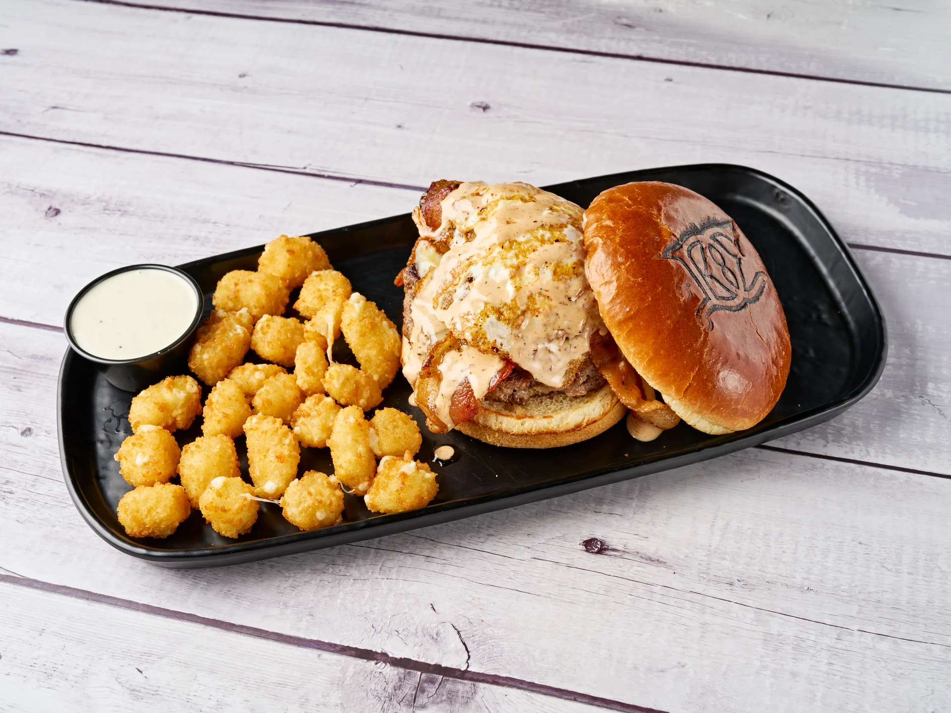 Electrifyingly delicious Caramelized Onion, White Truffle Pub Cheese Served on A Pretzel Bun