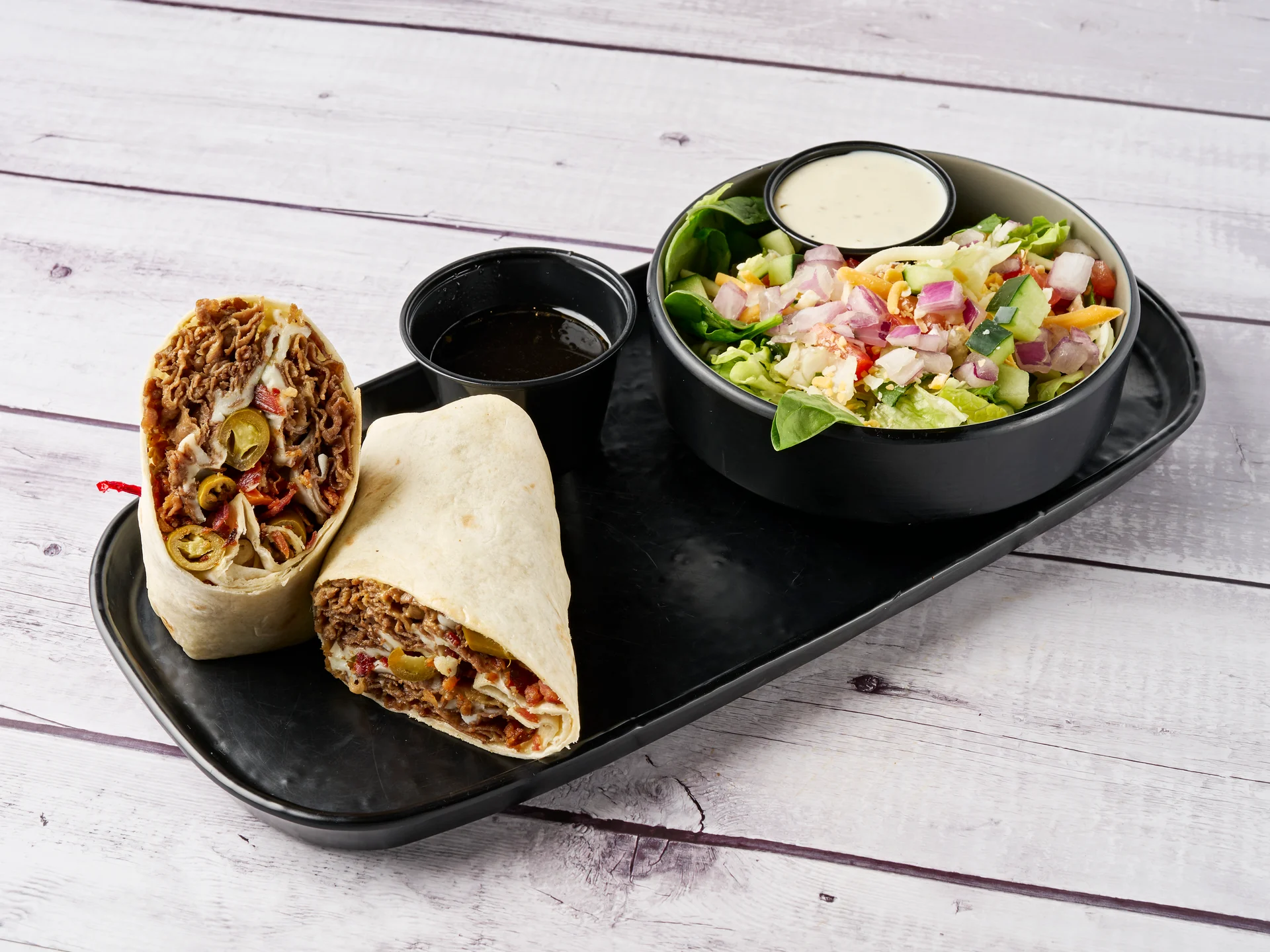 Thinly sliced Italian beef, melted mozzarella cheese, giardiniera and bacon wrapped in a warm flour tortilla.