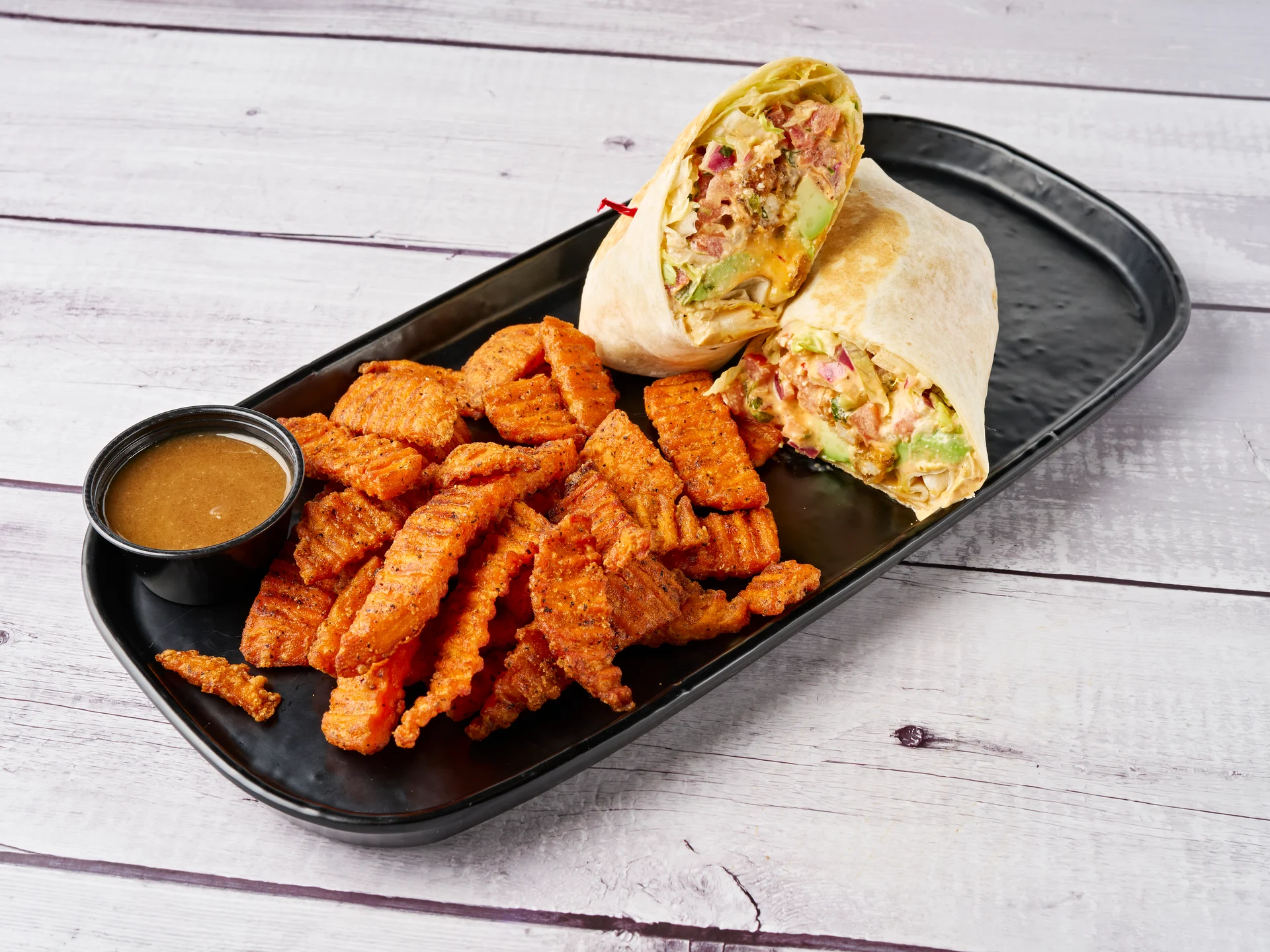 Crispy fried chicken, bacon, lettuce, tomato, and mayo, wrapped in a warm flour tortilla.